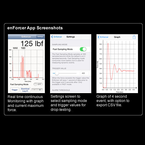 The Enforcer App for iOS devices greatly increases capabilities of the Enforcer Load Cell, adding the ability to monitor static forces remotely and record dynamic events at up to 500 samples per second. With the app you can also view a graph of the force or send as an email attachment for further analysis. App developed by Ourea slf. Sold separately through the App Store. Click here to watch the Enforcer App Video!
