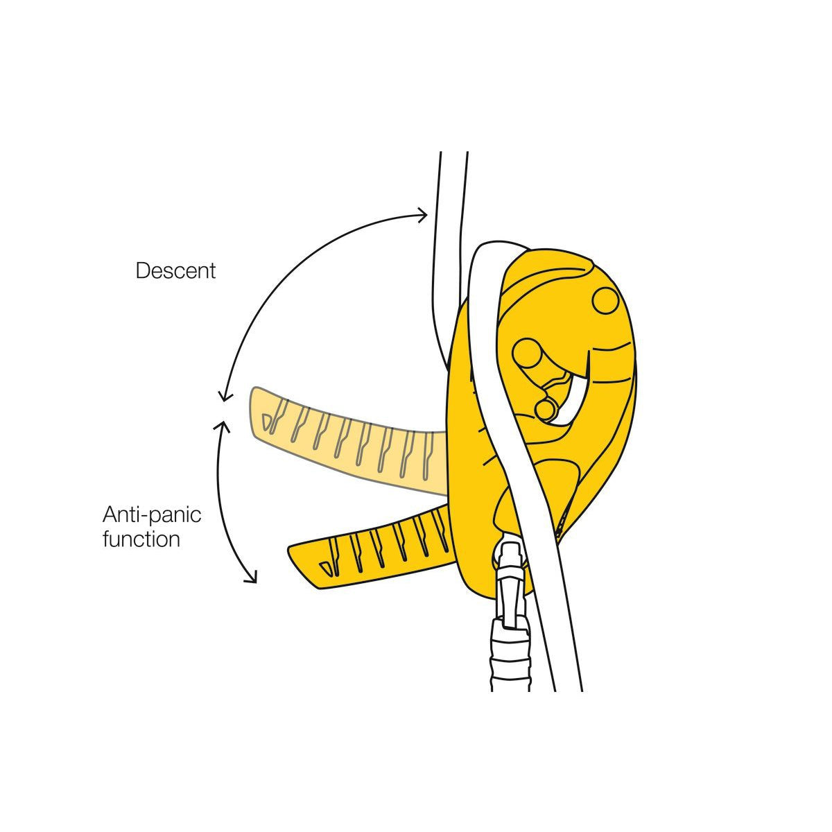 - ergonomic handle allows the rope to be released and enables comfortable control of the descent. Two possible descent modes: on the side plate or in the V-shaped friction channel