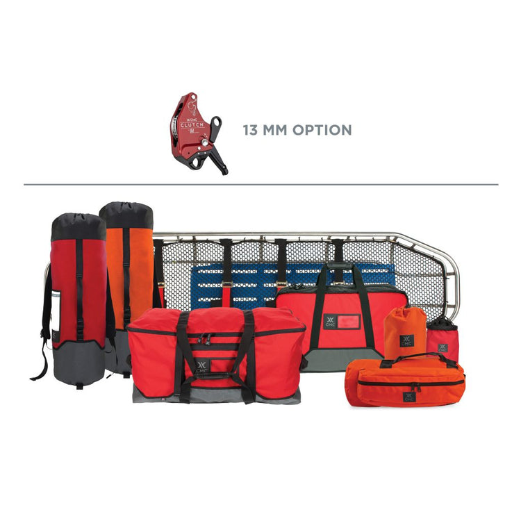 The equipment provided allows for a main and belay line, mechanical advantage, litter with patient-packaging system, gear for building anchors, AZTEK PROSERIES® LT System, and two of the CMC CLUTCH™ BY HARKEN INDUSTRIAL™ for efficient raising and smooth lowering. Innovative features of the CLUTCH make it ideal for technical rescues including the ratcheting rotating sheave, Anti-Panic brake, force limiting protection, and integrated becket.