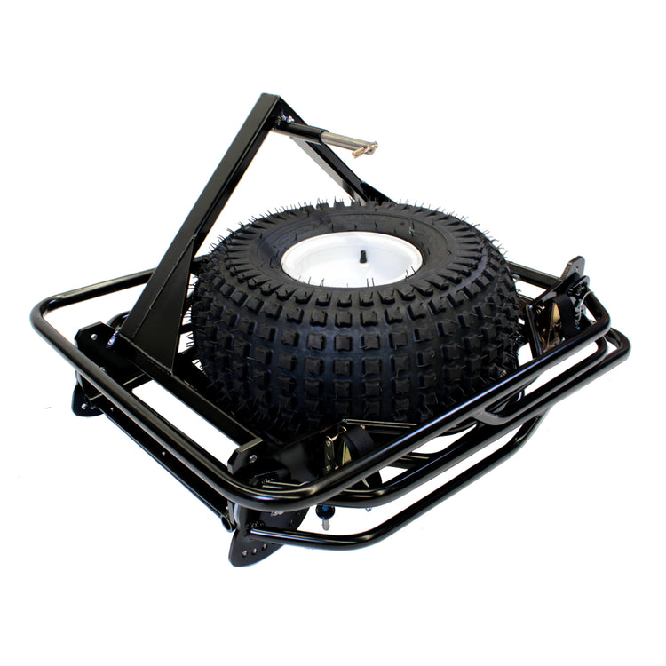 The universal design is compatible with any type and style of rigid litter. Its single wheel design makes it ideal for narrow trails, allowing agility, versatility and ease of movement even in the roughest terrain. The ATV wheel offers tracking ability and shock absorption for smooth and comfortable patient transport. Fast ratchet securing system locks basket stretcher with two straps and two rubberized steel hooks. Quick-release pins, each with a wire lanyard, lock into position with ease on each side of the handle. Its unique uni-support design allows the wheel to be quickly and easily removed for compact storage and transport.
