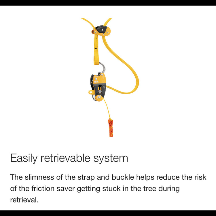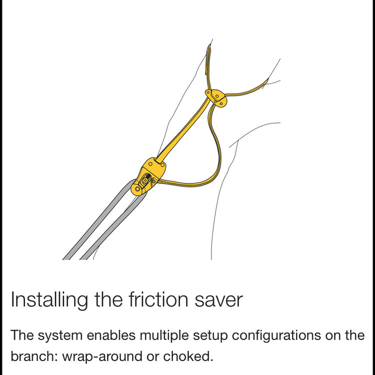 Designed for tree care, the EJECT friction saver allows the work rope to be set up, without damaging the tree, even in narrow forks. It offers multiple setup configurations on one or two branches and has an adjuster that allows precise length adjustment of the friction saver. Rope ascents and movement in the tree are optimized, thanks to the high-efficiency pulley which facilitates rope glide at the anchor. The included retrieval ball makes the system easily retrievable from the ground.